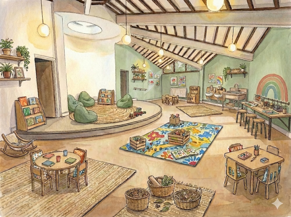 Our outside space connects to the inside allowing free flow, into a warm, homely retreat with natural textures, gentle colours, and cosy spaces that feel safe and familiar. Together, these environments nurture confident, curious learners who shine in their own unique way.